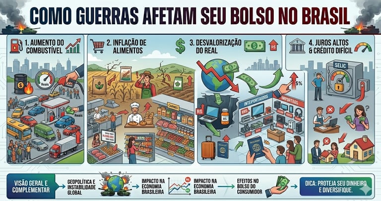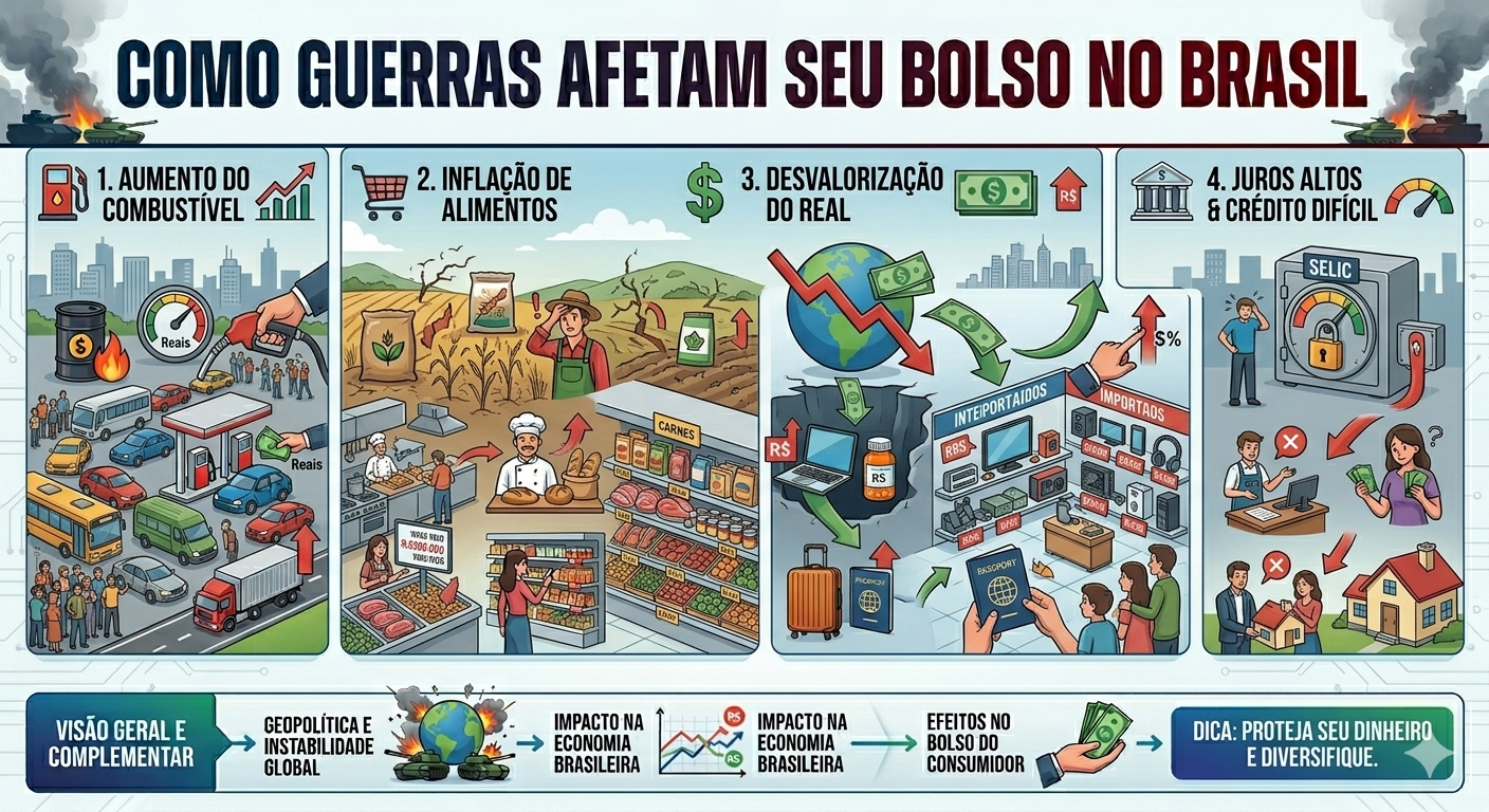 Quando pensamos em guerra, geralmente imaginamos algo distante — tanques, conflitos e disputas políticas. Mas a verdade é simples: mesmo longe do conflito, o impacto chega direto no seu bolso. E muitas vezes, você nem percebe que está pagando essa conta.